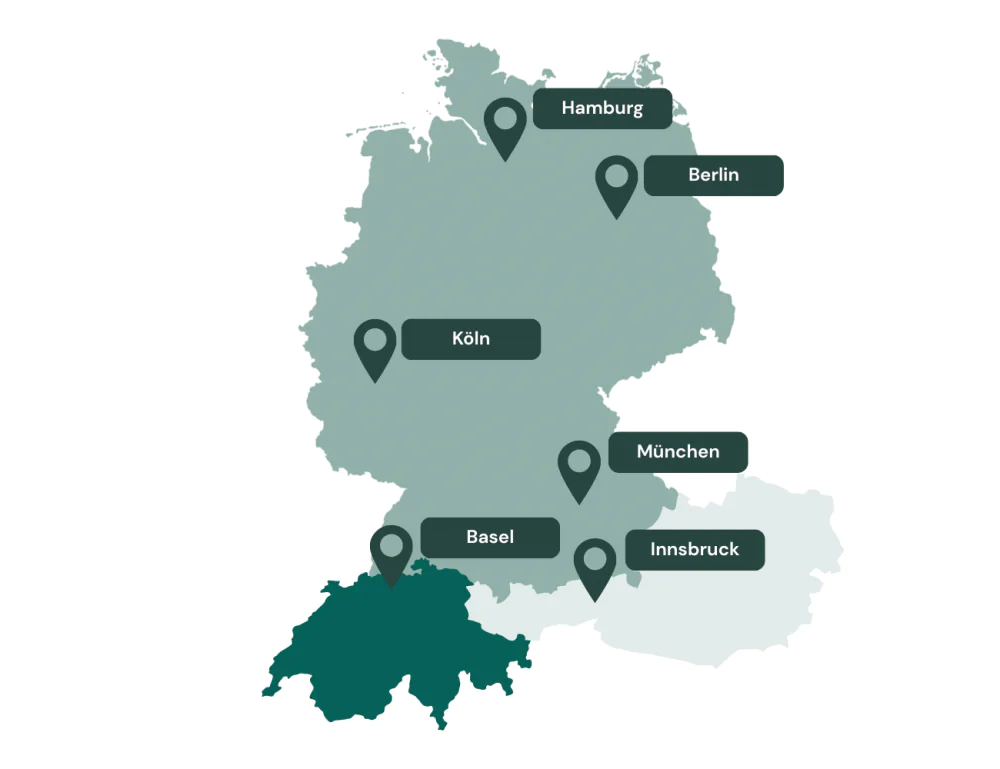 Mit Standorten in Deutschland, Österreich und der Schweiz begleiten wir unsere Kunden in der gesamten DACH-Region – mit regionaler Expertise, persönlicher Nähe und fundiertem Marktverständnis.